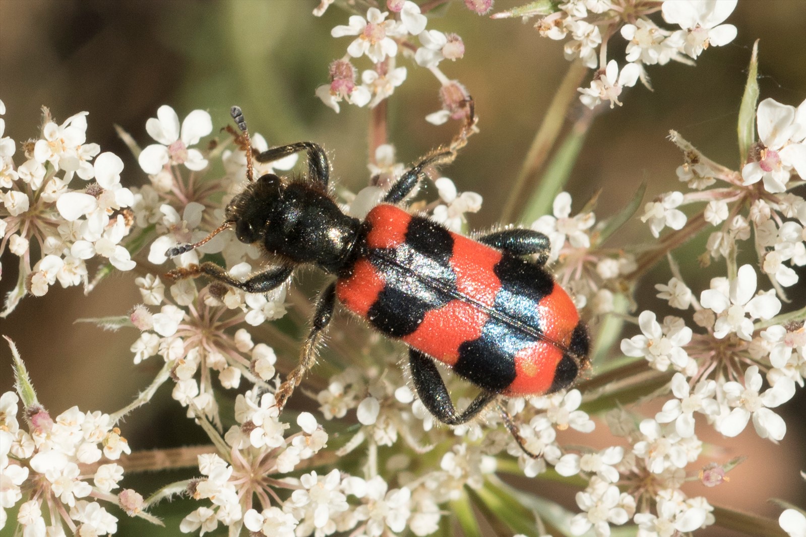 Ce coléoptère est facilement reconnaissable par ses élytres rouges avec des bandes noires. Sa tête et son thorax noirs comportent une pilosité jaunâtre à roussâtre. L'adulte se nourrit de petits insectes et de pollen. La femelle pond ses oeufs dans les nids d'abeilles. La larve mange les oeufs des abeilles.